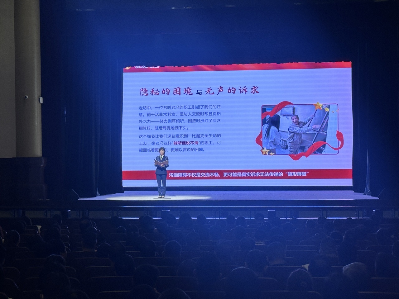 总结交流活动现场,阎良区总工会、高新区总工会、西安市总工会财务部、西安市职工帮扶服务中心等分别做以《用心“听”见无声的需求》《起于微光 终燃星河》《贴心服务暖企心 实干担当促发展》《用心帮扶暖人心 实干笃行促成长》等为题的交流发言。未央区总工会、灞桥区总工会则分别以《暖阳》《初心》为题,将工会干部大走访过程中的一些感人故事化作情景剧,在台上生动展示。