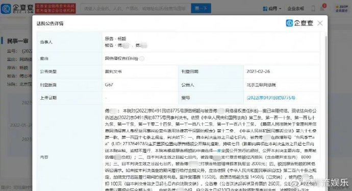 @青流娱乐 消息,企查查APP显示,近日,91在线精品一区二区北京互联网法院刊登一则Angelababy(杨颖)诉傅某某网络侵权责任纠纷裁判文书。被告傅某某在账号“台风季节aa”(原昵称香港朱皮)需要在微博置顶位置向原告杨颖公开赔礼道歉,支付原告杨颖经济损失8000元,精神损害抚慰金 2000元。此前“香港朱皮”曾造谣说杨颖与古天乐结婚。