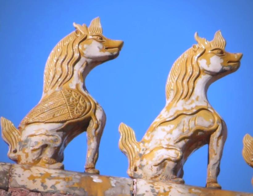故宫三大殿之一的太和殿,是最高等级的重檐庑殿顶宫殿。殿顶正脊两端的大吻,各由13块琉璃构件组成。每条檐角上都列队站着琉璃仙人和神兽,分别是龙、凤、狮子、天马、海马、狻猊、押鱼、獬豸、斗牛、行什,其设置颇有讲究。